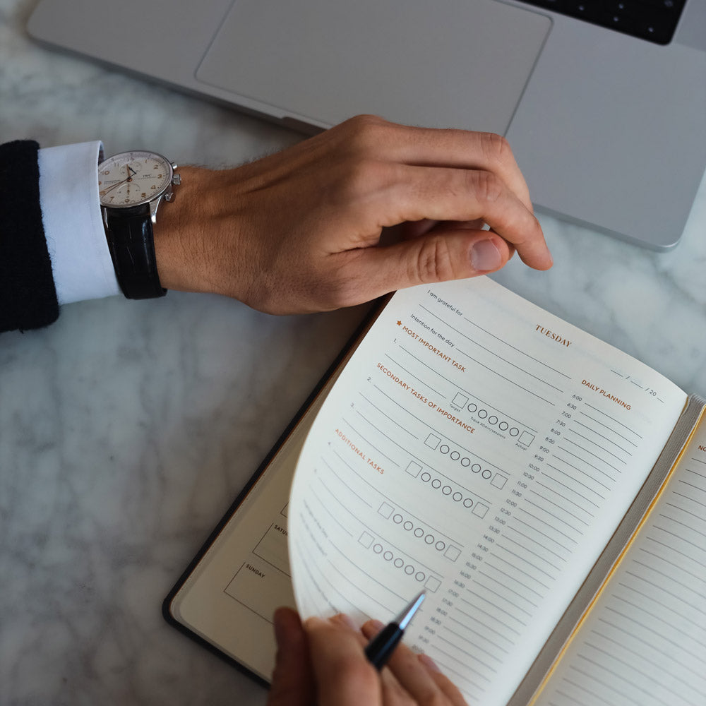 Going analogue will usually do the trick. Take the Productivity Planner or Daily Desk Pad for example: they encourage you to put pen to paper every day and narrow down your to-do list to five important tasks, organized by order of priority. It’s an easy way to map out your day and ensure that you’re being productive, but also that you’re not taking on too much and leaving time for yourself.
