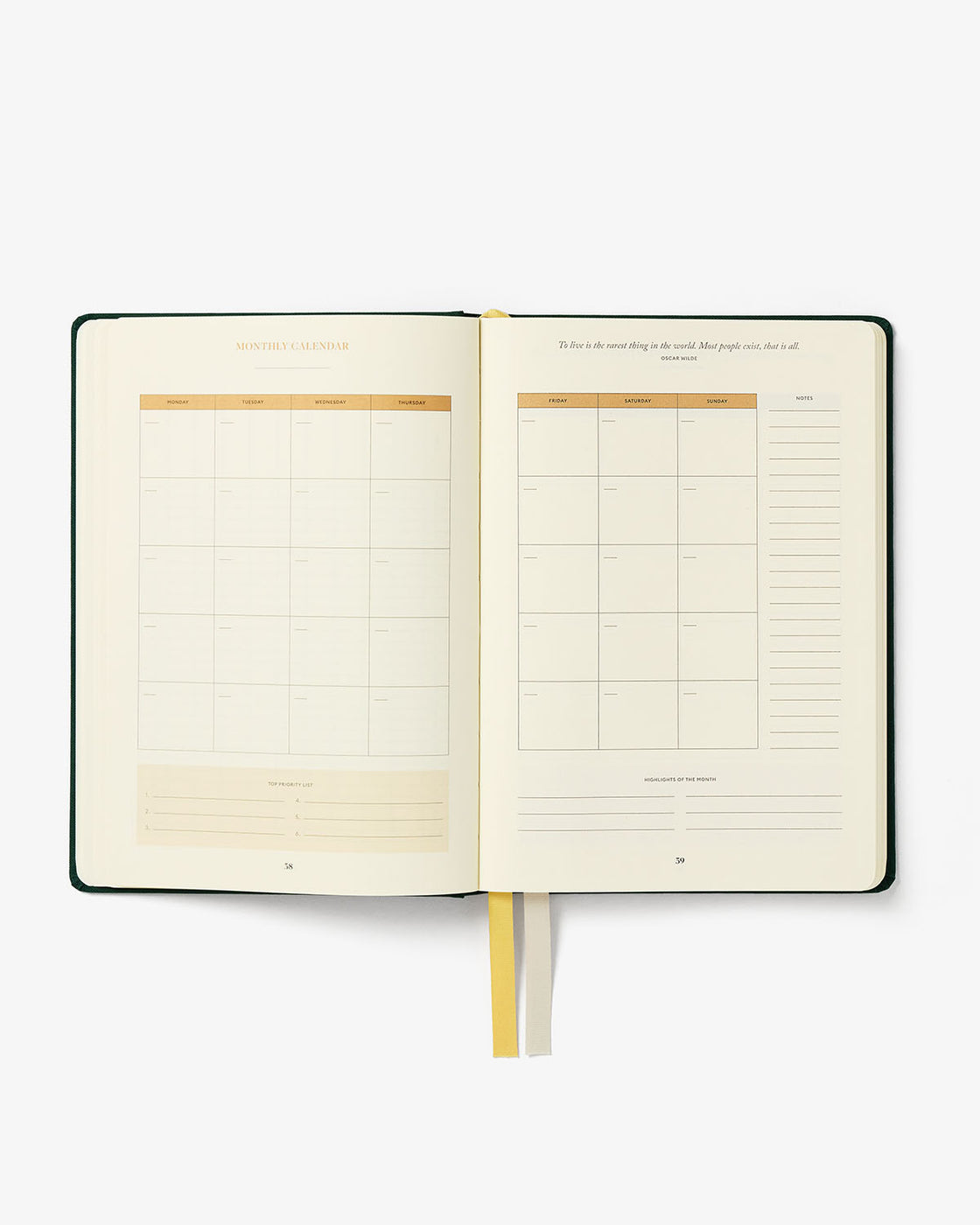 - The planner has an undated monthly calendar;