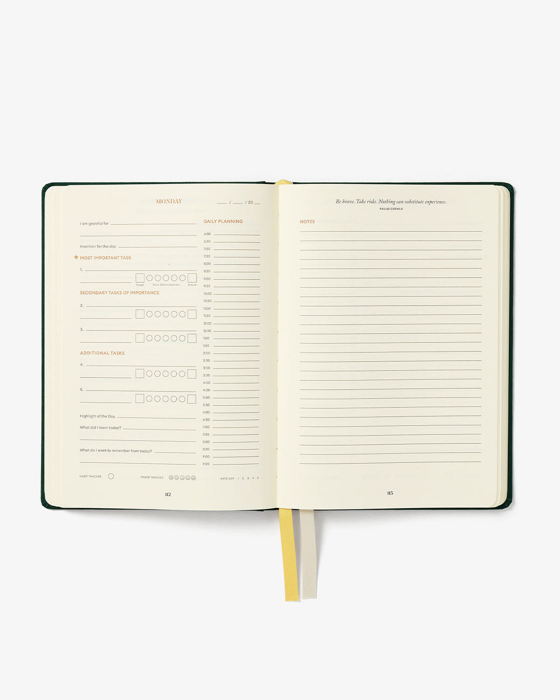 - Daily planning has a 2-page layout: it features daily schedule from 6am to 9.30 pm; morning and reflection self-growth prompts; mood and productivity trackers; and a full-page of notes.