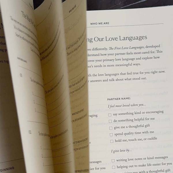You fill out the journal together. Some prompts are designed for you to answer together, and others you each fill out and then share with each other. The mix makes it a fun date night experience and memory keepsake hold onto, years later.