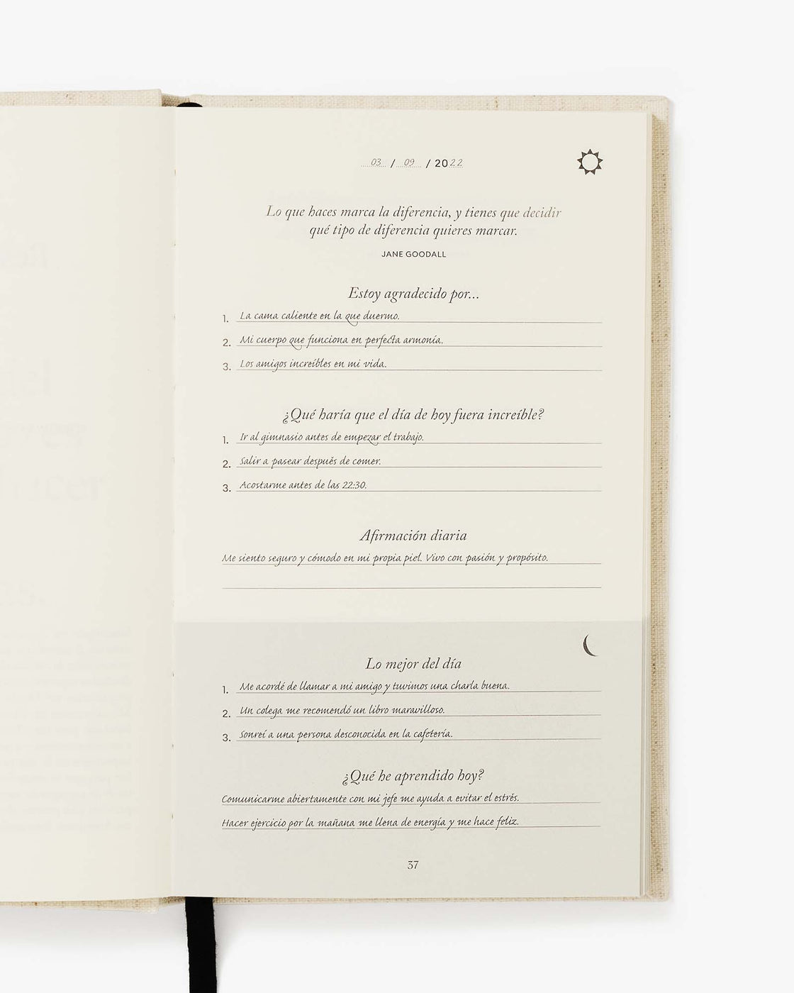 → The Five Minute Journal uses industry-leading cotton thread for the sew binding, removing polyester (synthetic, plastic) stitching commonly used in book production.